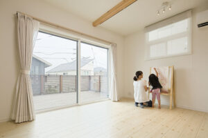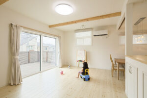 リビングの天井を少し高くすることで部屋全体が広く感じます。トトロップ調のフローリングが全体をやさしい雰囲気にして、良い感じです。