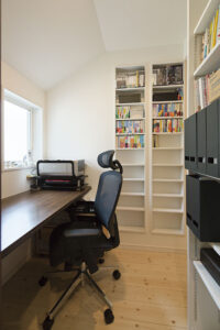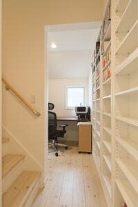 ご夫婦ともに文庫本やCDが相当数との事でしたので、2Fに壁厚収納を配して、部屋を狭くする事なく収納力をアップしたのもポイントです。