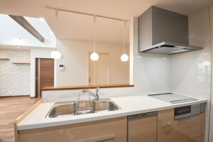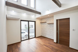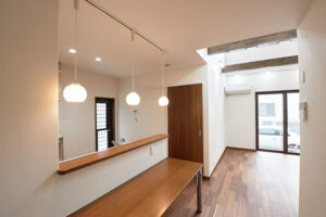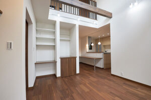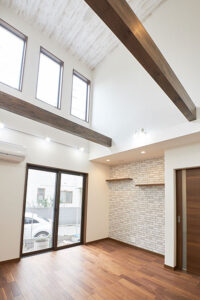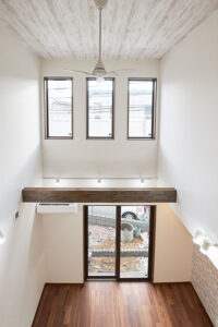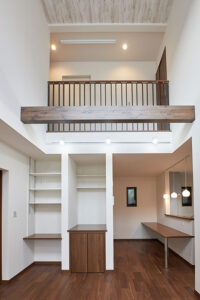 明るく広いリビングが建物の中心に位置して回遊できます。2Fまでもが吹抜けを通じて一つの空間として感じられると思います。また、全熱交換型換気を上手に作用させているので、広々としていても、エアコン1台で過ごしやすい環境が実現出来ています。
