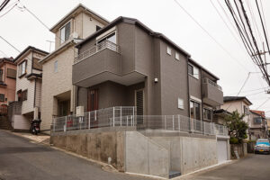 「道路との高低差1.8m」,「角地」,「道路斜線の影響’大’」などの難条件もあり、お施主様の要望を取り入れてくれる工務店に辿り着けない中、ご紹介を受けて出会ったのが当社です。